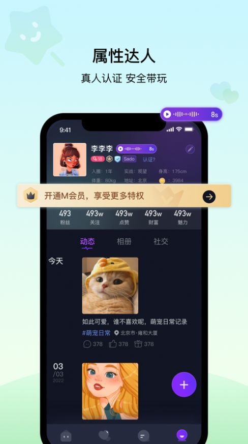 1、提供了类似于陌陌、微信朋友圈的交友互动功能,让用户随时随地与好友在一起;