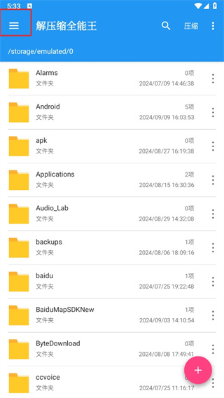 1、首先打开解压缩全能王app,进入到首页中后点击左上角的【三横图标】;