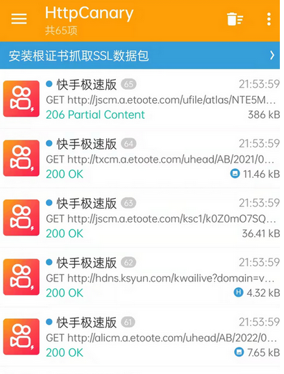 1、在本站下载小黄鸟抓包软件(HttpCanary)安装,然后打开小黄鸟抓包工具,添加目标应用 ,这里以“快手极速版”举例。