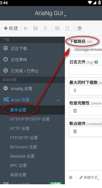 2、点击“系统设置”下面的“Aria2设置”-“基本设置”-“下载路径”;