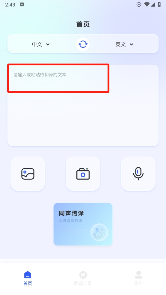 1、进入软件后直接在首页看到翻译功能,支持输入或者粘贴翻译的文本;