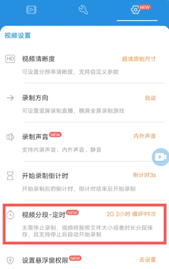 4、在视频分段中,调整分段时长、分段大小和循环次数,点击确定,视频录制权限功能就设置成功了