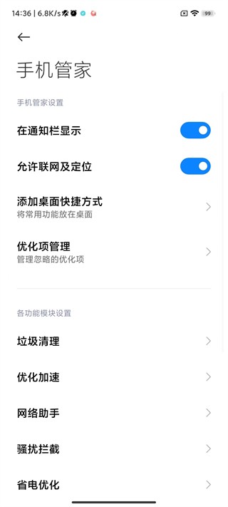 小米手机管家是一款手机安全防护软件,软件能够有效帮助用户清理诸多手机中的缓存垃圾,及时恢复手机存储空间,让你的手机运行更快更稳定,不会再出现游戏卡顿或者内存空间不足的情况。包含了一套强大的保护和优化工具,应用程序锁定,数据使用,安全扫描,清洁,电池节约,阻止列表,还拥有垃圾请里、病毒扫描、电池性能、优化加速等功能,一键即可清理手机空间,让手机运行更加流畅。