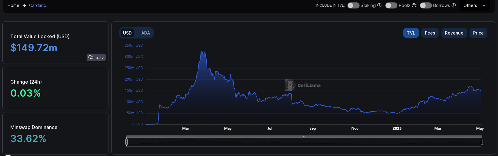 尽管如此,Cardano 的总锁定价值(TVL) 实现了健康增长,从 4 月初的低点 1.3861 亿美元增至 1.713 亿美元的高点。TVL 在本月下半月确实出现下滑,收于 1.529 亿美元,但仍高于 4 月的低点。其目前的 TVL 为 1.4972 亿美元。