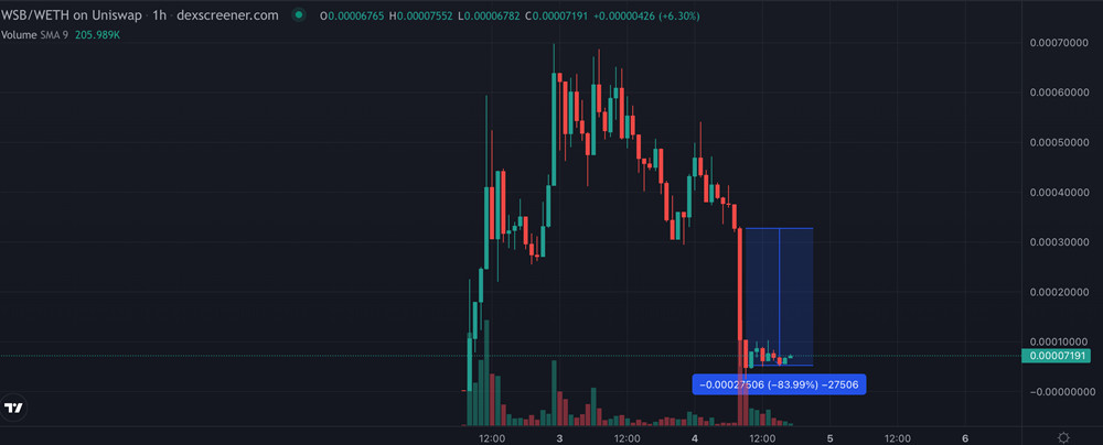 其中与Wall Street Bets(海外论坛Reddit上的一个有关股票和期权的讨论版,在GME轧空事件爆发后爆红)相关的迷因币WSB Coin($WSB)在今(4)日传出Rug pull。